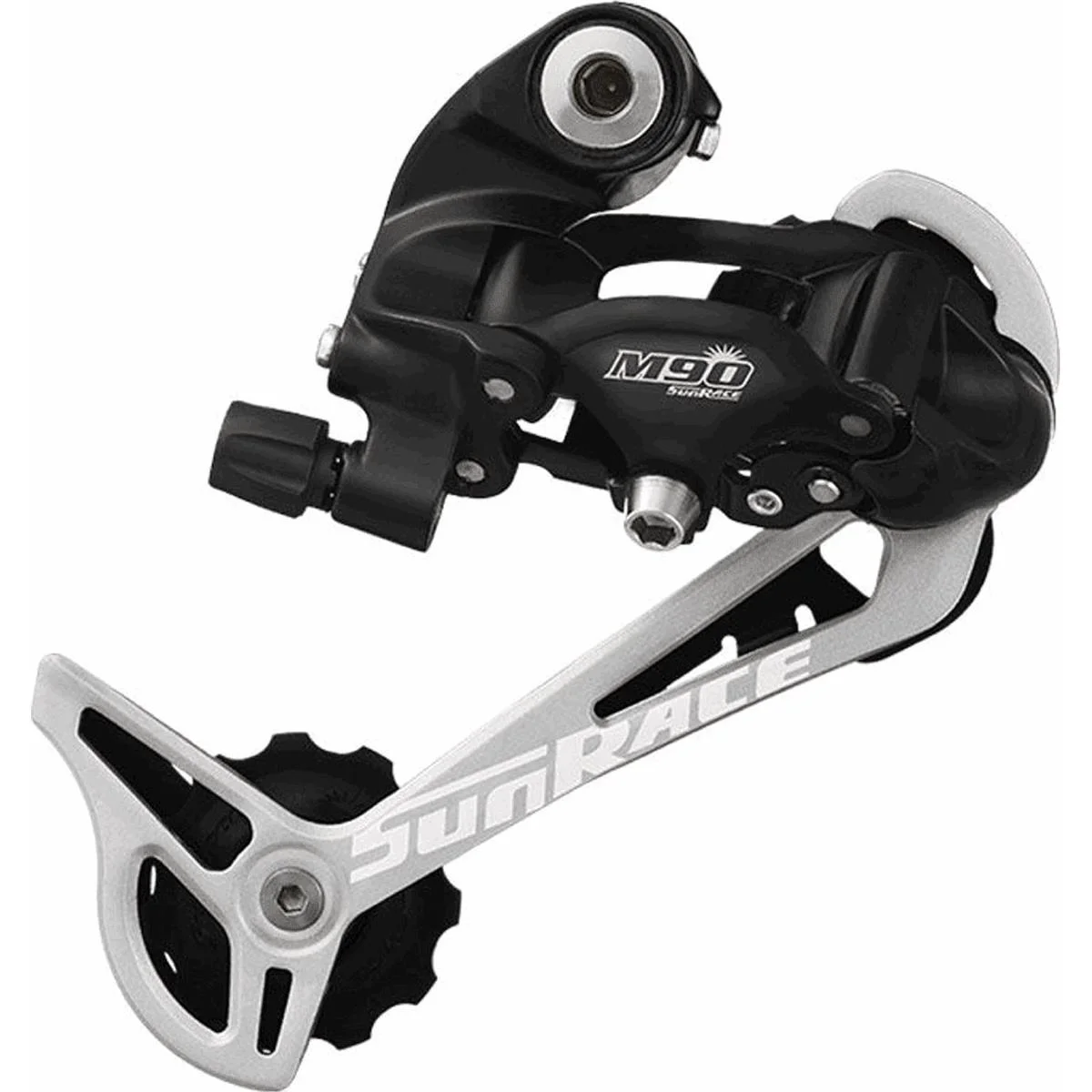 9-speed MD90 rear derailleur with long aluminum cage designed for reliable lightweight performance on 11-34 tooth cassettes.