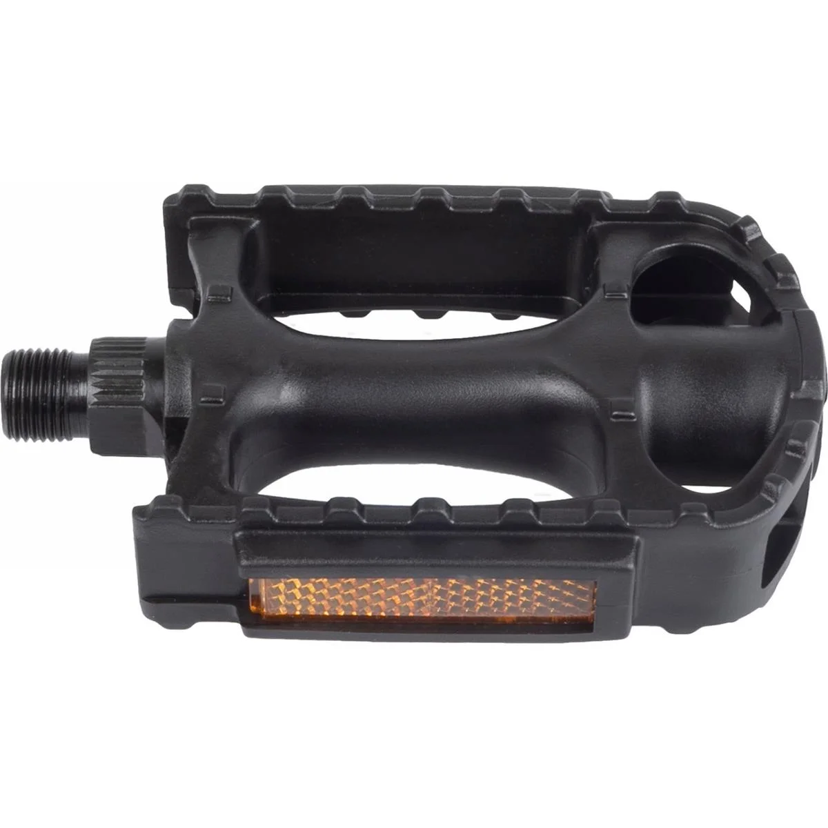 Black plastic MTB pedal with slip bearing and integrated reflector for reliable everyday riding.