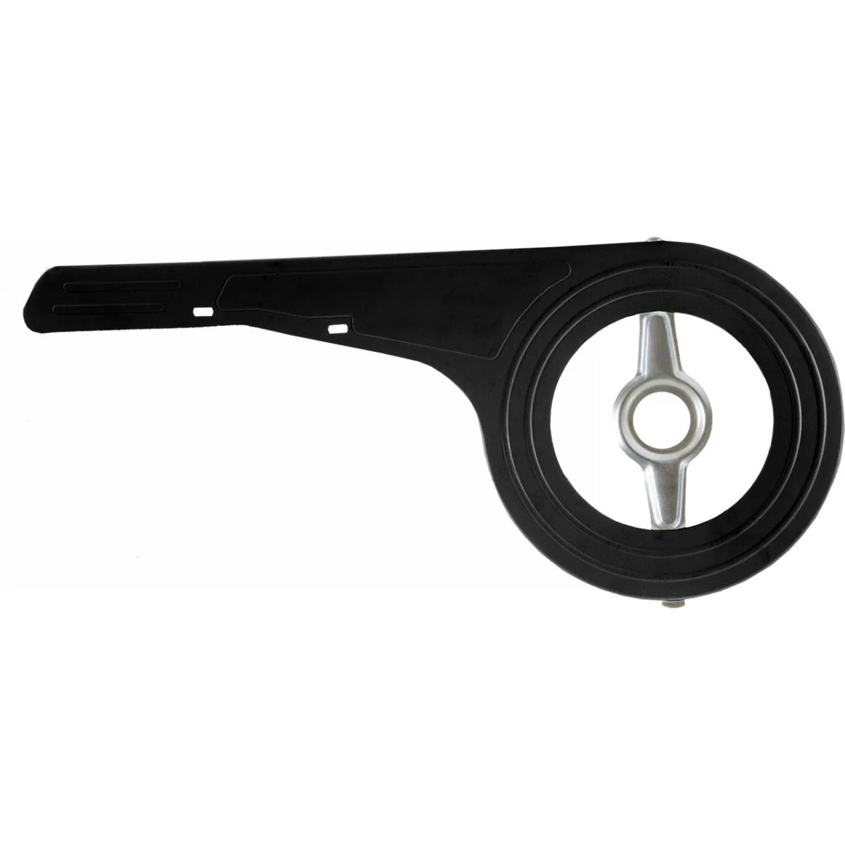 Protect your bike chain with a durable easy-to-install chain guard. Made of black plastic this chain guard fits 38 to 48 tooth chainrings and includes mounting hardware.