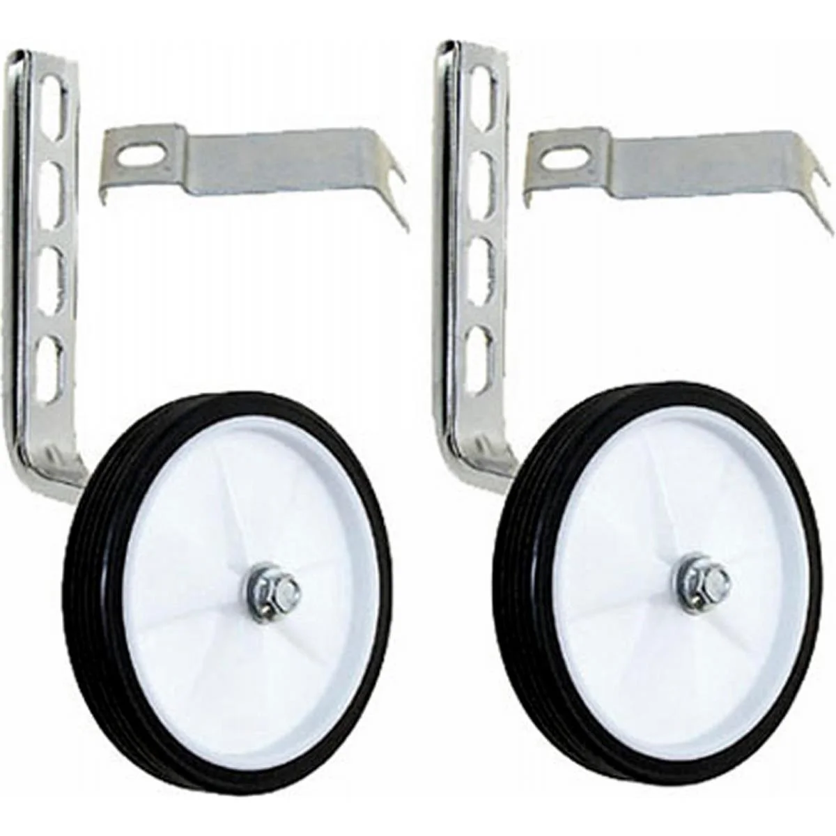 White training wheels designed to help children learn to ride by providing extra stability and confidence.