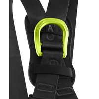 Comfortable adjustable full body harness designed for high rope courses and adventure parks. Padded back and hip elements provide long lasting comfort while color coded shoulder hip and leg straps make putting the harness on intuitive and allow quick visual checks by instructors. Eight Slide Block buckles enable precise fit across a wide range of heights and sizes. A dorsal eyelet certified to EN 361 offers an additional attachment point and an integrated RFID transponder simplifies identification and inspection tracking.