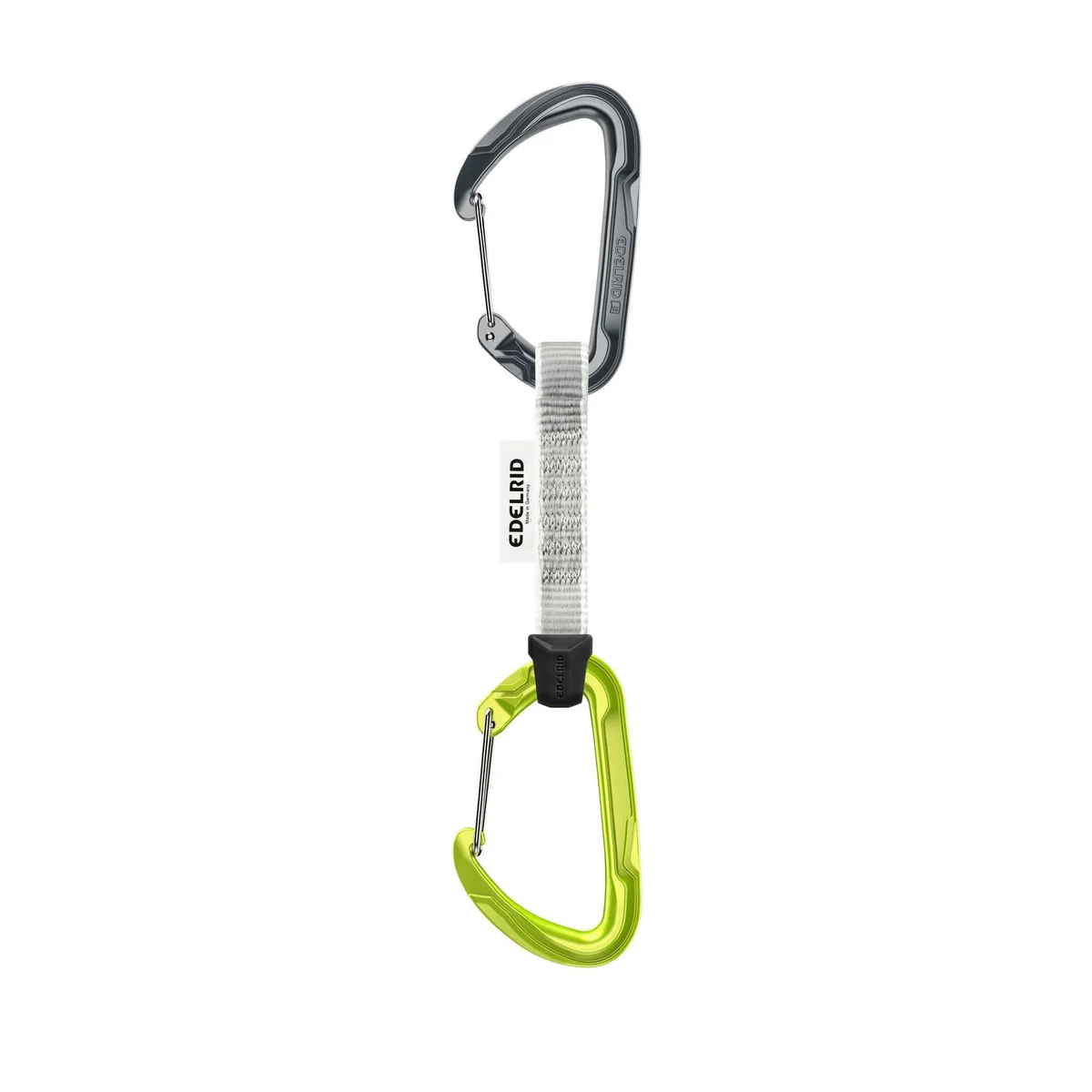 Lightweight and durable quickdraw for sport climbing featuring wire gate carabiners on both ends and a 16 mm polyester sling with ANTITWIST fixing on the lower carabiner.