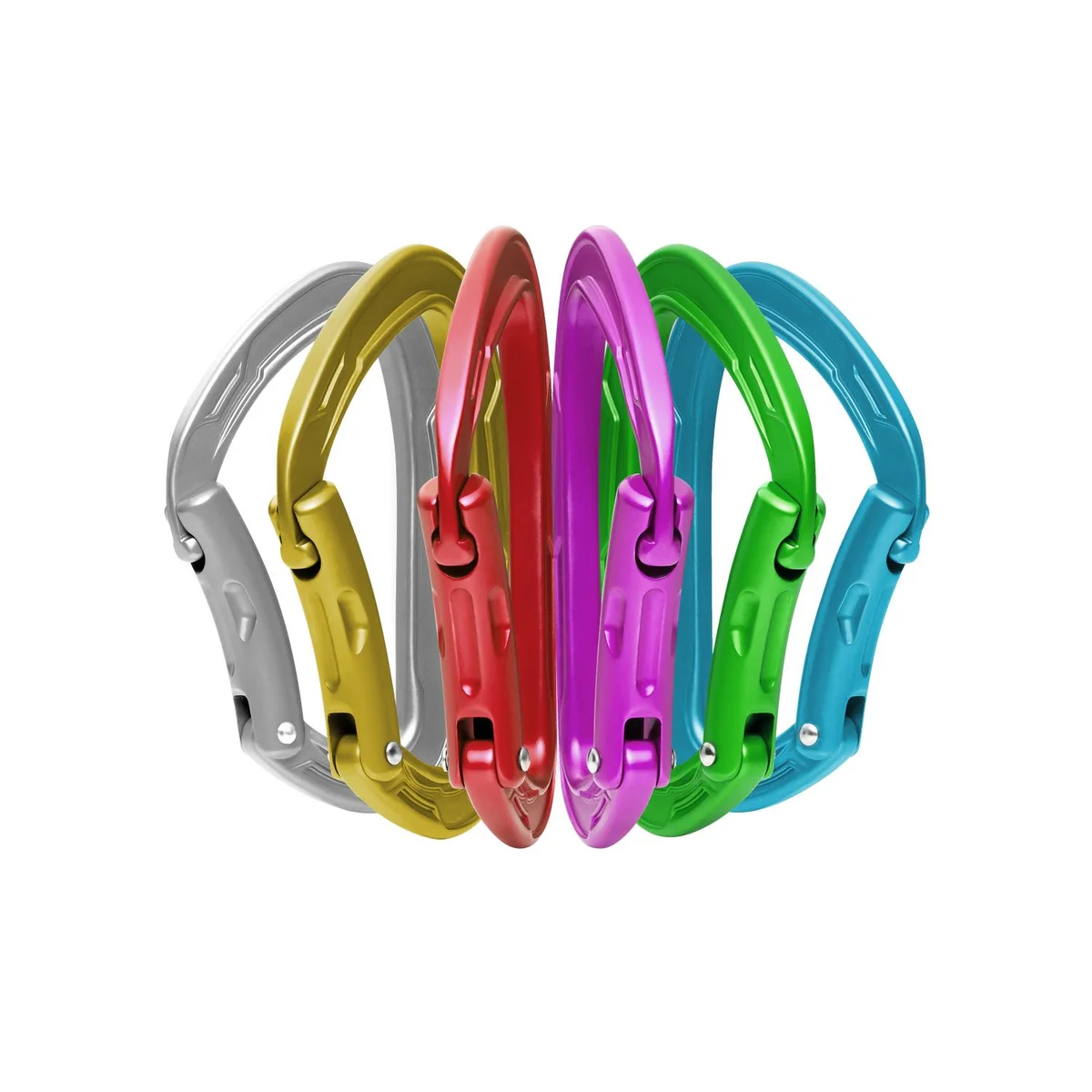 Pack of six aluminium carabiners with a bent gate for fast and convenient clipping. Assorted colours matched to camming devices for easy identification.