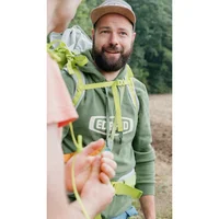 Casual hooded sweatshirt in an organic cotton and recycled polyester blend featuring a large chest graphic or patch for relaxed everyday wear.