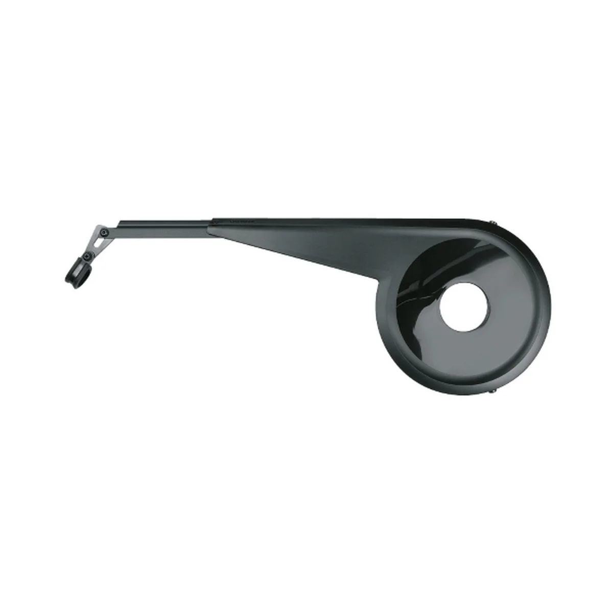 Telescopic extension and adjustable angle bracket adapt to a wide range of frame geometries and component combinations. Supports chainrings up to 38 teeth and is made from durable polycarbonate.