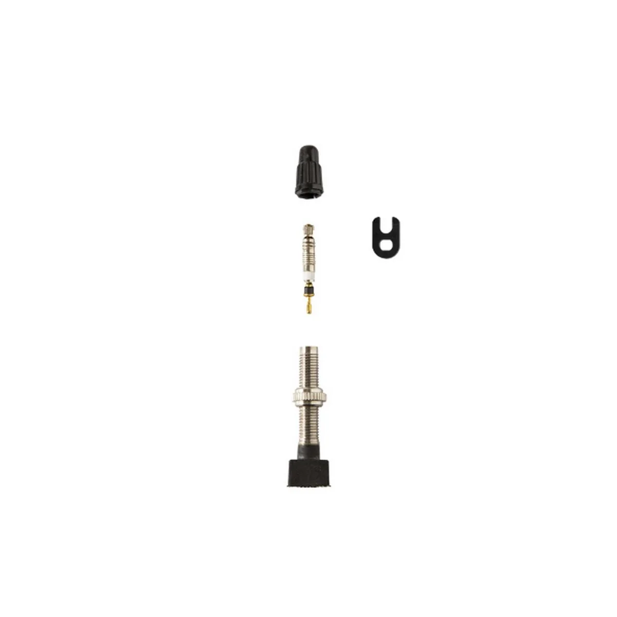 Removable Presta tubeless valves 40 mm brass silver pack of 2 for easy installation and quick maintenance of tubeless setups.
